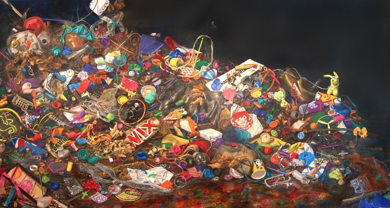 The current exhibition features a diverse group of paintings composed from natural and manufactured detritus Mallinson collected from the streets on her daily walks through her neighborhood. Decaying plant materials and a fantastical assortment of post-consumer items are deftly interwoven in monumental accumulations suggesting trash dumps, ocean gyres, and urban alleyways, or in intimate, singular portrait forms. The rich details, dazzling color, variety of objects and interplay of forms are rooted in 17th century Dutch still life painting as well as Cubist collage. Intermittent thick painterly gestures within the predominantly figurative compositions further the conversation with iconic Modernist painting. Past, present and future are evoked, prompting questions concerning the complexities and moral dilemmas of living in an a techno consumerist, disposable world as we simultaneously contribute to its demise. Post- apocalyptic, darkly humorous, critical and celebratory at once, “Unmade” revisits Marcel Duchamp in the 100th anniversary of his “Readymades”. The 17 foot painting, “The Large-Blass-t”, a word play on Duchamp’s “The Large Glass”, depicts hundreds of found objects floating down through a stormy, smoke-filled Turner-esque sky. As Duchamp elevated common objects to the status of art, Mallinson’s images of degraded commodities situate us once again in a provocative endgame.