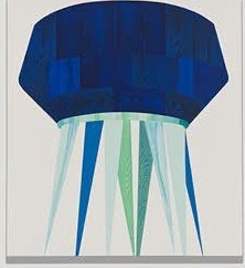 Baker·s paintings engage illusionist spaces that are frontal and often confrontational.  Forms frequently appear as if they are above us and honed attention is paid to locating the viewer in gradations of space. The iconic Icy blue watch tower or water tank of \”Atwater\” is both looming and precarious; its triangulated supports explicitly perched on tippy toes at the very bottom edge of the painting, teasing out tension with shrewd economy. But the stacked elongated girders or jack hammered masonry rubble of \”Barre\” negotiate a closer distance. The simple, pared down shapes conjure an austere sense of sculpture. Conversely, the crisp graphic precision of Baker’s paint handling with its reductive shorthand, layers the work with the character of elegiac cartoons– slightly sinister scenarios of construction projects abandoned or gone awry. Like disaster tourists, we pick our way through elegantly reductive prismatic chunks.