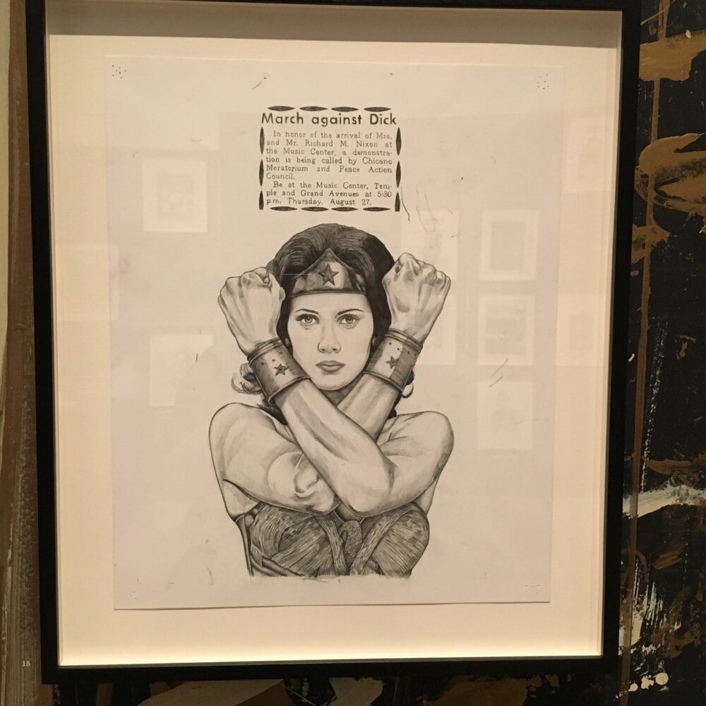 As stated in the wall text,  Vincent Ramos’ BCAM installation  RUINS OVER VISIONS OR SEARCHIN’ FOR MY LOST SHAKER OF SALT (ANTE DRAWING ROOM) engages with the past and present through various forms of collecting and archiving. The artist gives as much weight to an advertisement from TV Guide as he does to primary documents drawn from historical archives. In this installation, Ramos has created an “anteroom” out of cast-off theatrical backdrops salvaged from local high schools. He populates this mini-museum with images of both Mexican American pop-culture icons, including singers with Anglicized names, and performers like Mary Tyler Moore and Bill Dana, who masqueraded as Latinos in the media.