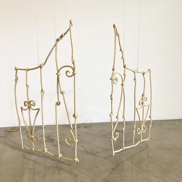 In Susan Aparicio’s work, she brings together religious symbols and contemporary cultural and political references, reframing them to build a cosmology of her own. Star Montana’s tender depictions of the Los Angeles and San Gabriel rivers engage with her family’s matrilineal ties to water, both honoring and grieving this sacred source of life. Transformation, renewal, and turning with intention to her surroundings are central tenets in Lizette Hernández’s practice, reminding us to look to each other and to the land as we envision alternative futures. Rendering wrought iron gates in delicate clay, Claudia V. Solórzano celebrates a quintessential architectural detail rapidly disappearing in the face of gentrification. Through the use of industrial and organic materials reflective of the city itself, Libbi Ponce produces futurist sculptural objects that are both familiar and otherworldly.